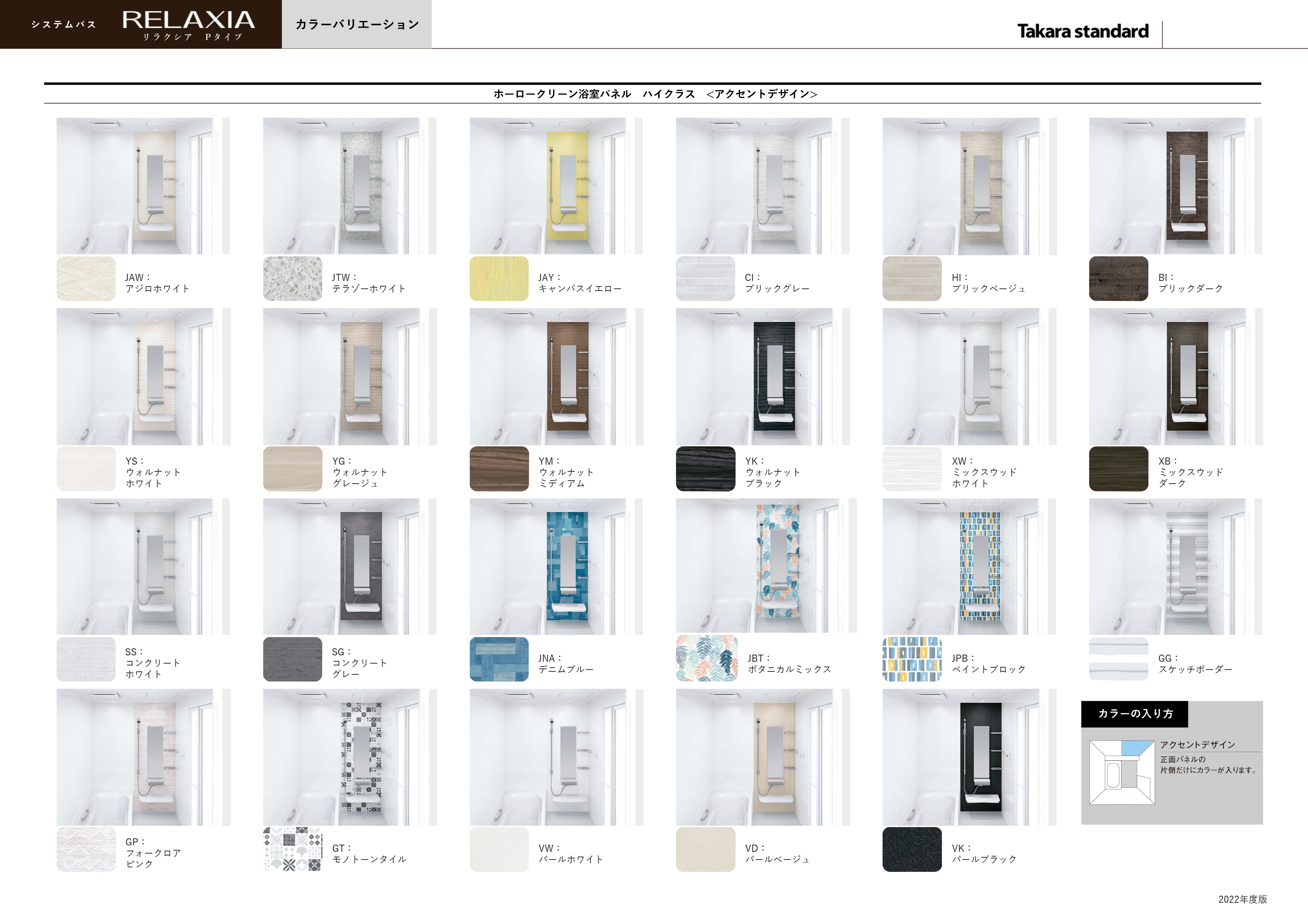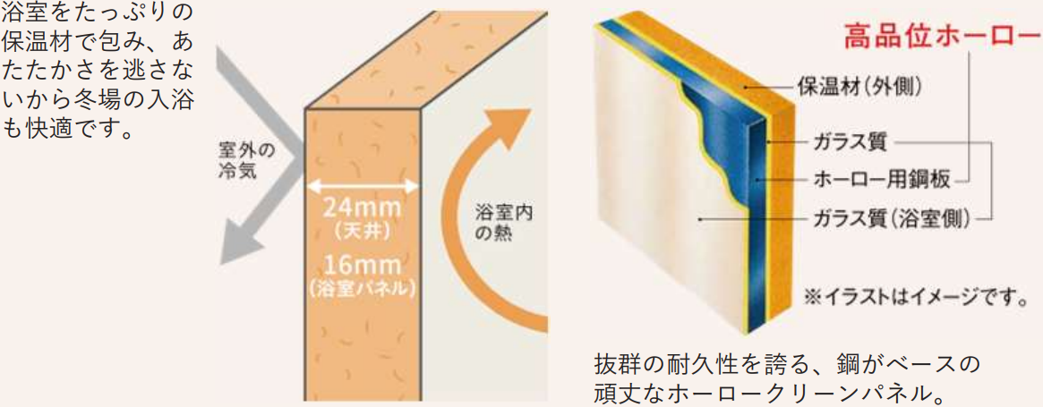 高品位ホーローだからお手入れカンタン!浴室全体を保温材で包み込んでいるので冬もあったか。震度6強相当の振動にも負けない耐震性だからもしものときも安心。カラーバリエーションも豊富で、お好みに合わせてコーディネートできます。
