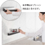 カウンター側の壁面に設置できる収納棚です。取外し可能なので、お手入れもカンタンです。