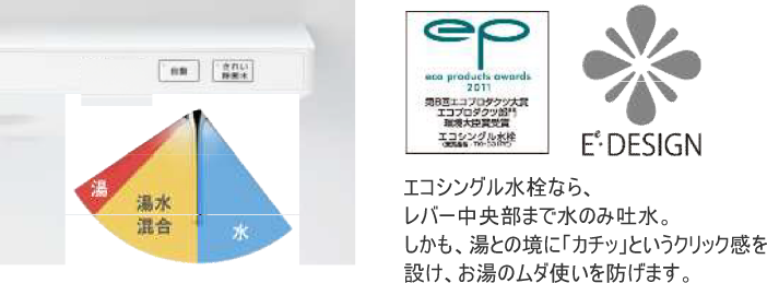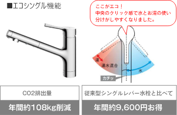 お湯と水をきちんと使い分けられる「エコシングル水栓」