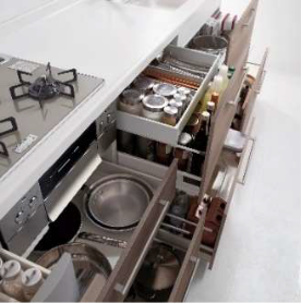 キッチンマットを敷いても巻き込まない引き出しとほこりやごみが入らないけこみパネルでお掃除ラクラク。