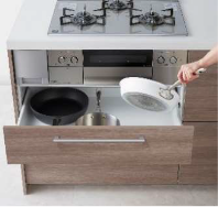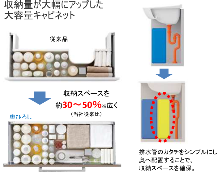 ムダなスペースの原因となっていた排水管の配置や構造を見直し、広い収納スペースを確保。