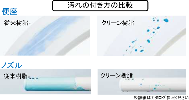 「ウォシュレット」の便座とノズル・ケースには防汚効果の高いクリーン樹脂を採用。汚れをはじくから、汚れてもサッとひとふき。