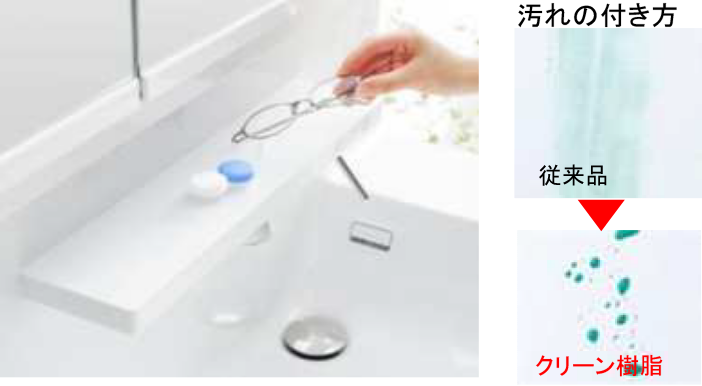 水栓本体ケースには、撥水性と防水効果が高い「クリーン樹脂」を採用。汚れをはじいてサッとふきとれます。