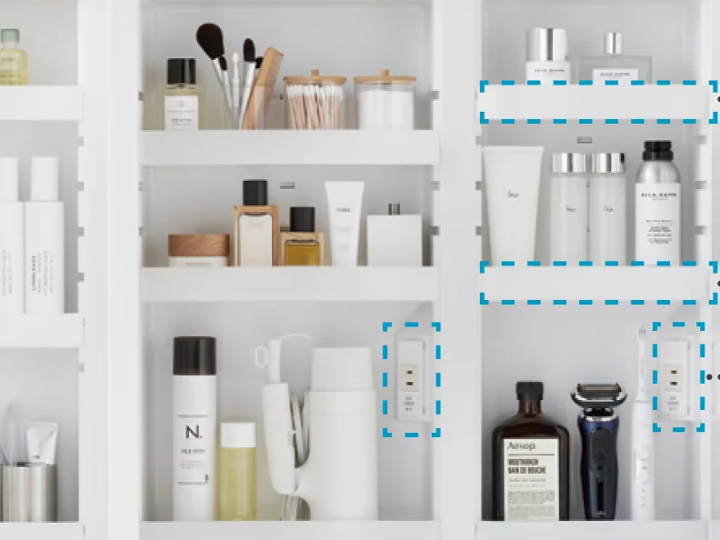鏡裏はすべて収納スペースになっています。日常的に使用するものを収納するのに便利です。