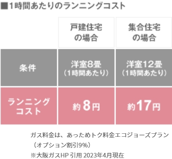 1時間あたりのランニングコストは、戸建て住宅の場合は約8円、集合住宅の場合は約17円です。