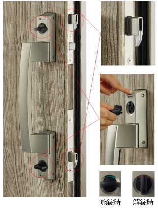 上下とも鎌錠を採用。デッドボルト(かんぬき)についた鎌が錠受けにしっかりかみ合さります。