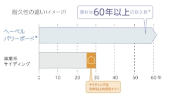 サイディングなどの外壁材は、30年までしか耐久性が想定されていません。ヘーベルパワーボードの耐久性は60年以上。リタイア後も安心してお住まいいただくことができます。