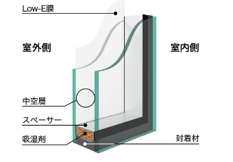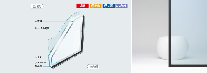 二枚のガラスの間に6mmほどの空気層を設けた「中空層」が、高い断熱効果をもたらします。 さらに、外に面するガラスの内側に「特殊金属膜」をコーティングし、高い遮熱効果を実現しています。