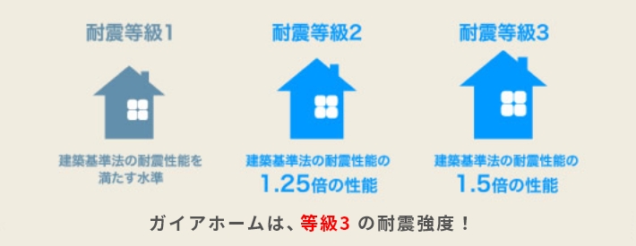 等級3は、耐震等級1の1.5倍の地震⼒に耐えられるだけの性能・耐震強度⽔準です。