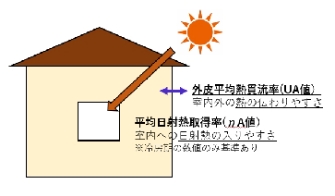 イラスト図にもありますように、外⽪平均熱貫流率は『熱の伝わりやすさ』、平均⽇射熱取得率は『⽇射熱の⼊りやすさ』と表せます。