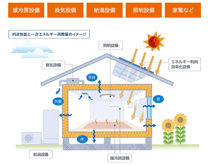 そういった生活上、必要な設備機器が、どれだけ省エネなタイプが採用されていて、「エネルギーをムダに使わなくても快適に過ごせる家」かどうか?の指標になってきます。